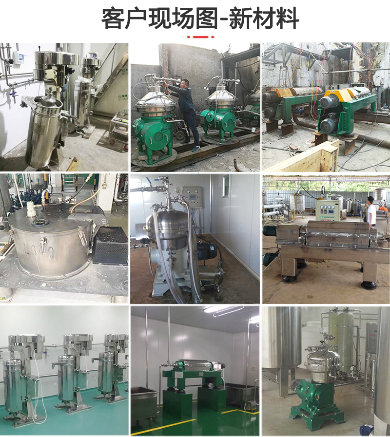 應用設備:根據新材料生產工藝的不同,物料的不同參數,可適用的離心機有管式離心機、碟式離心機、臥螺離心機、平板離心機,其選擇依據主要有處理量、含固量、分離效果等因素。