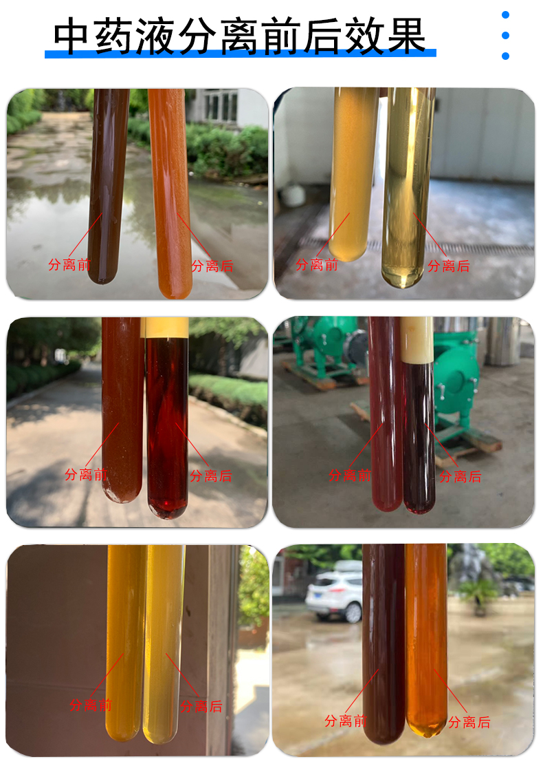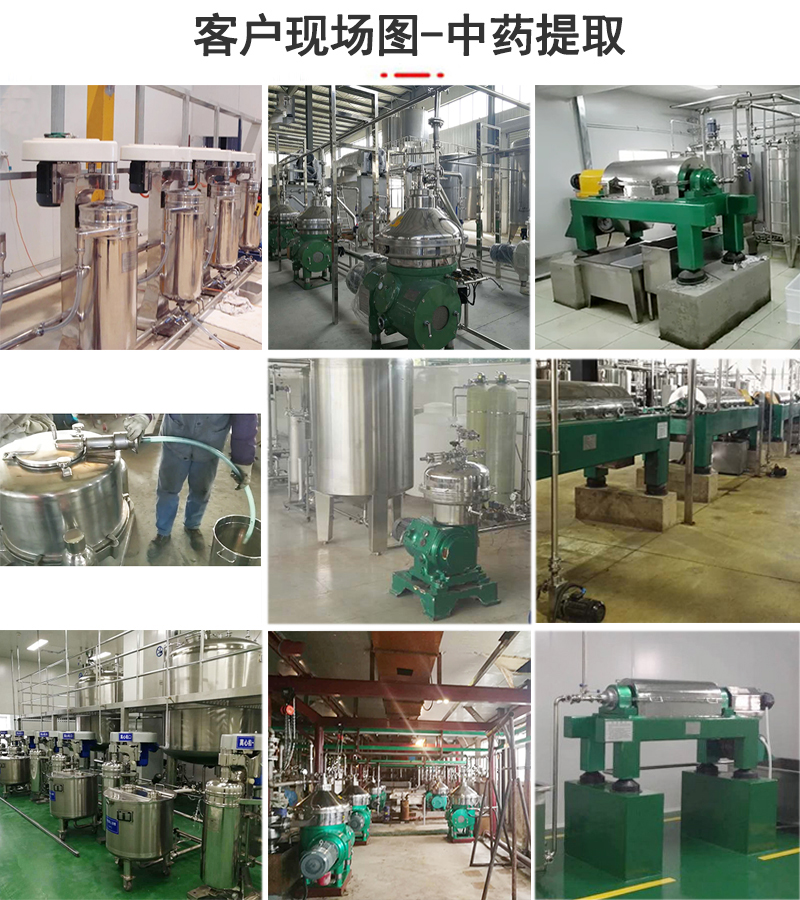 應(yīng)用設(shè)備:根據(jù)中藥生產(chǎn)工藝的不同,物料的不同參數(shù),可適用的離心機(jī)有管式離心機(jī)、碟式離心機(jī)、臥螺離心機(jī)、平板離心機(jī),其選擇依據(jù)主要有處理量、含固量、分離效果等因素。